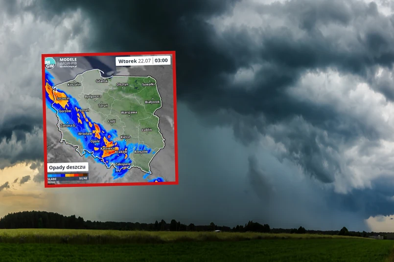 "Prognozowane są burze, którym miejscami będą towarzyszyć bardzo silne opady deszczu od 25 mm do 35 mm, lokalnie 55 mm, oraz porywy wiatru do 90 km/h. Lokalnie grad" – czytamy w komunikacie IMGW. Ostrzeżenie będzie obowiązywać do wtorku do godz. 8.00.