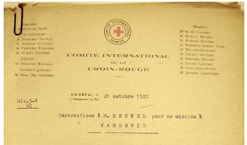 2. 21 października 1920 r. Instrukcja dla Luciena Brunela, sekretarza Misji Międzynarodowego Komitetu Czerwonego Krzyża w Genewie udającego się z polecenia MCK do Warszawy, gdzie – we współpracy z delegatem-asystentem MCR w Polsce, Victorem Gloorem – miał za zadanie zbadać m.in. kwestie związane z sytuacją sierot i jeńców wojennych >>>