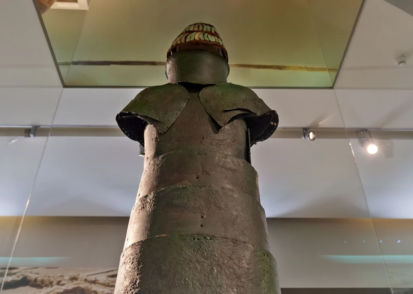 Znalezisko to pełny pancerz płytowy, którego elementy z brązu łączono za pomocą skórzanych rzemieni. Tułów żołnierza chronił dwuczęściowy kirys z naramiennikami i wysokim kołnierzem osłaniającym szyję, kark i podbródek. Od pasa w dół zbroję tworzy fartuch z trzech par szerokich, wygiętych płyt, sięgający kolan wojownika. Uzupełnieniem pancerza był hełm z kłów dzika z płytami chroniącymi policzki. Eksperci sądzą, że do zbroi należały też nagolenniki i osłony przedramion, przymocowywane do kończyn lnianymi pasami.