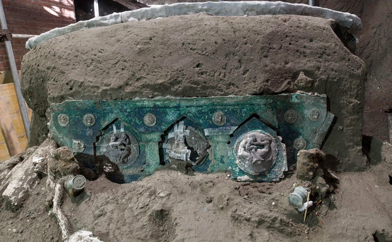 Wóz czterokołowy ozdobiony motywami amorków, nimf i satyrów znajdował się na terenie tej samej okazałej wilii, koło której przed kilkoma miesiącami znaleziono szczątki dwóch mężczyzn, a wcześniej w 2018 roku trzech koni.