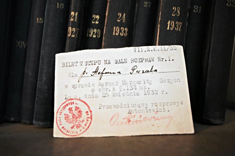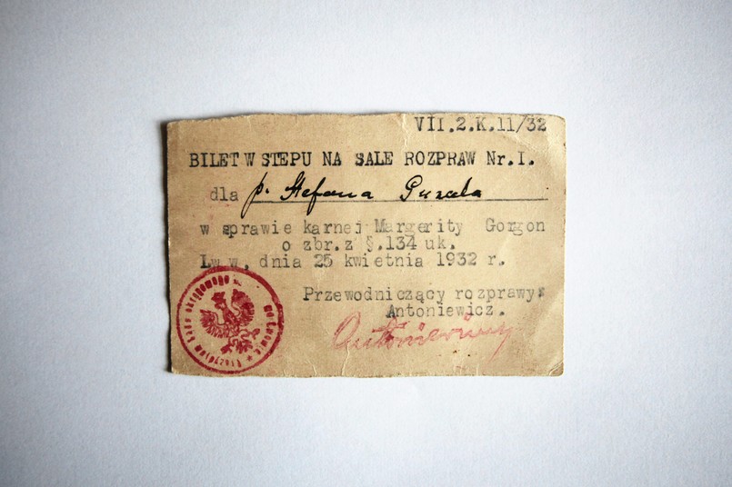 Bilet wstępu na salę rozpraw Nr.I. dla p. Stefana Puzaka w sprawie karnej Margerity Gorgon z zbr. z §. 134 uk. Lwów, dnia 25 kwietnia 1932 r. - można przeczytać na pożółkłym skrawku tektury przechowywanym w Muzeum Historycznym Miasta Krakowa. 80 lat temu dla osób emocjonujących się najgłośniejszym procesem II Rzeczpospolitej był bezcenny.