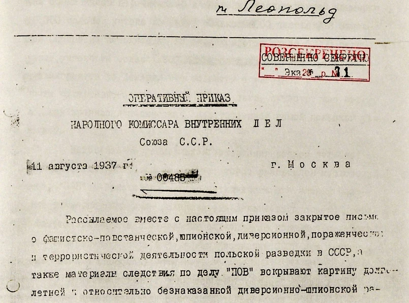Zachował się rozkaz, jaki trafił do siedziby sowieckiej bezpieki w Charkowie. Został wystawiony w Moskwie, 11 sierpnia 1937 roku, i podpisany przez szefa NKWD Nikołaja Jeżowa. Nosi numer 00485.