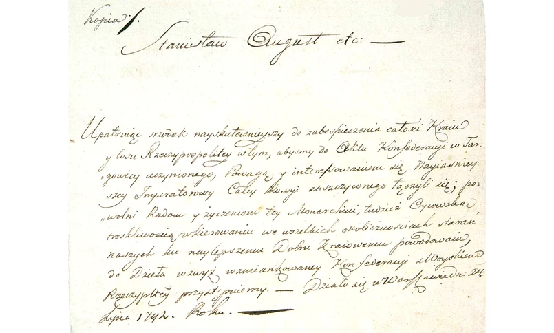 „(…) Sejm dzisiejszy, na niedziel tylko sześć zwołany, przywłaszczywszy sobie władzę prawodawczą na zawsze, a już przeszło przez lat półczwarta ciągle ją ze wzgardą praw uzurpując, połamał prawa kardynalne, zmiótł wszystkie wolności szlacheckiego, a na dniu 3 maja r. 1791 w rewolucję i spisek przemieniwszy się, nową formę rządu, za pomocą mieszczan, ułanów, żołnierzy, narzuconą sukcesję tronu postanowił, królowi od przysięgi, na pacta conventa wykonanej, uwolnić się dozwolił, władzę królów rozszerzył, rzeczpospolitą w monarchię zamienił, szlachtę bez posesji od równości i wolności odepchnął, wolę narodu, w instrukcjach wojewódzkich daną, za nic poczytał, karę, nieprzyjaciołom Ojczyzny wymierzoną, na tych, co by przeciw tym bezprawiom użalać się śmieli, rozciągnął, wojsko narodowe do przysięgi na bronienie ustanowionej niewoli przymusił, (...), w wojnę szkodliwą przeciwko Rosji, sąsiadki naszej najlepszej, najdawniejszej z przyjaciół i sprzymierzeńców naszych, wplątać nas usiłował” – dokument takiej treści, podpisany 27 kwietnia 1792 roku, a datowany na 14 maja, podsunął polskim magnatom generał Popow.