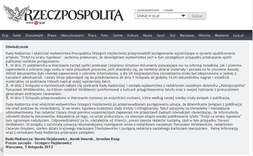 Tekst uznajemy za nierzetelny i nienależycie udokumentowany. Pan red. Cezary Gmyz (autor artykułu - PAP) pomimo wcześniejszych zapewnień nie przedstawił żadnych oświadczeń, stwierdzając, że informatorzy odmówili złożenia dokumentów - czytamy w oświadczeniu rady nadzorczej Presspubliki. Władze spółki twierdzą, że zapewniłyby ochronę zarówno autorowi tekstu, jak i jego informatorowi i tę obietnicę złożyły mu na piśmie.