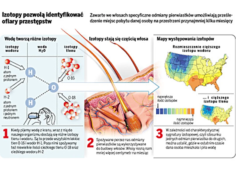 Dysponując tą wiedzą, członkowie zespołu pod kierunkiem geochemika Thure Cerlinga oraz biologa Jima Ehleringera zgromadzili próbki wody z kranu oraz kosmyki włosów z salonów fryzjerskich mieszczących się w 65 amerykańskich miastach. By uniknąć zafałszowania wyników badań, naukowcy wybrali miejscowości liczące najwyżej 100 tys. mieszkańców. Chodziło o to, by wyeliminować metropolie oblegane przez turystów. Analiza włosów oraz wody ujawniła, że istnieje silny związek pomiędzy ich sygnaturami izotopowymi. Oznacza to, że w trakcie wzrostu włos wchłania poszczególne odmiany pierwiastków, wbudowując je do swojej struktury. Co więcej, wiedząc, że rośnie on średnio centymetr na miesiąc, uczeni są w stanie prześledzić, gdzie w ostatnim czasie dana osoba przebywała i piła wodę.