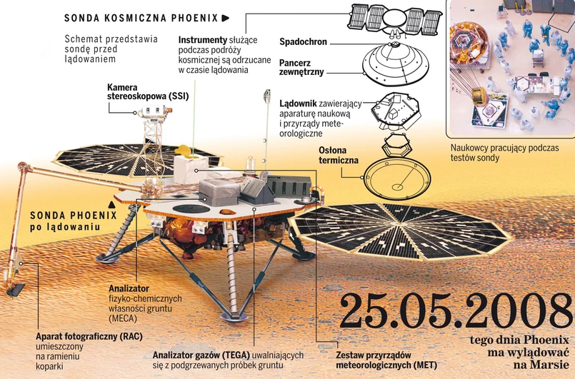 Misja Phoeniksa jest niesłychanie ważna, bo ma ustalić, kiedy woda na Marsie znajdowała się w stanie ciekłym. W tym celu lądownik sondy wyposażono w specjalne robotyczne ramię, dzięki któremu będzie mógł pobrać próbki lodu czy też zamarzniętej wilgotnej gleby z głębokości nawet pół metra. Analiza chemiczna tego materiału pozwoli potwierdzić lub obalić forsowaną przez naukowców tezę, że płynna woda istniała na Czerwonej Planecie stosunkowo niedawno - około 100 tys. lat temu. A jeśli na Marsie kiedykolwiek istniało życie, jego śladów trzeba szukać właśnie w marsjańskiej wiecznej zmarzlinie. Niewykluczone, że proste mikroorganizmy wciąż zamieszkują te obszary. Wyposażona w przyrządy meteorologiczne sonda pozwoli też wzbogacić naszą wiedzę o nieznane dotąd szczegóły na temat zmian klimatu, jakie miały miejsce w dziejach tego globu.