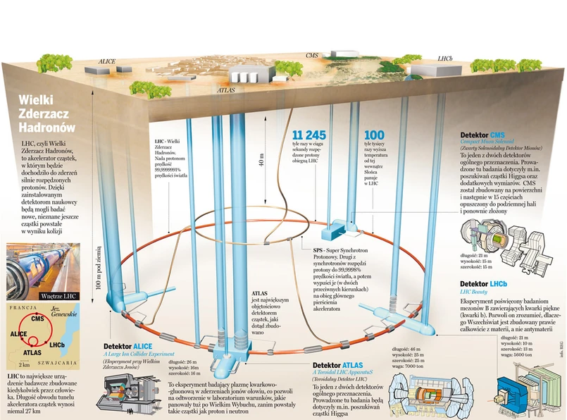 W LHC będziemy zderzać ze sobą czołowo "paczki” utworzone ze 100 miliardów protonów upakowanych w obszarze o grubości ludzkiego włosa i długości kilku centymetrów. Chodzi o to, żeby zwiększyć szansę zaobserwowania pojedynczego zderzenia, w którym utworzą się nowe cząstki, co powinno następować rzadko. Wyniki tych zderzeń będą obserwowane przez cztery gigantyczne detektory o rozmiarach kilkupiętrowych kamienic, umieszczone na pierścieniu LHC. Wewnątrz nich znajdują się setki precyzyjnych urządzeń pomiarowych wyposażonych w superszybką elektronikę. Chciałbym przy okazji powiedzieć, że w ich konstrukcji uczestniczyli również polscy fizycy, inżynierowie i technicy. Podobnie zresztą jak i przy budowie LHC. Polska jest jednym z dwudziestu krajów członkowskich CERN, czyli współwłaścicielem tego największego na świecie laboratorium.