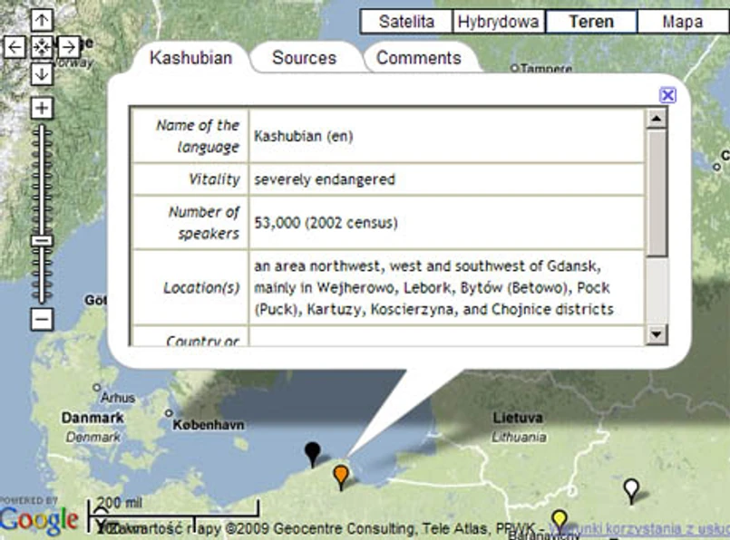 Najwięcej zagrożonych języków jest w Afryce Subsaharyjskiej, Indiach, Stanach Zjednoczonych, Brazylii, Indonezji i Meksyku. W Polsce na mapie zaznaczone są słowiński jako wymarły oraz kaszubski i używany w okolicach Bielska-Białej wilamowski.