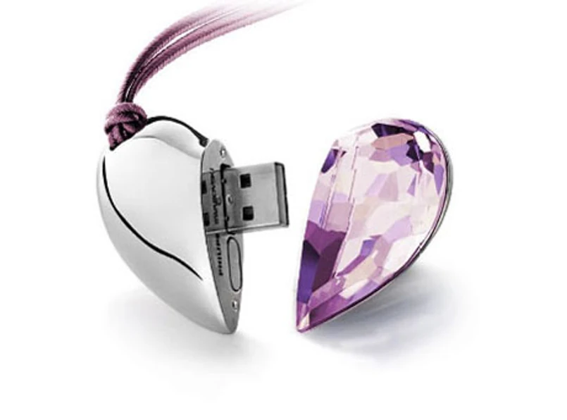 Gadżet z gatunku romantyczno-praktycznych. W srebrnym serduszku udekorowanym kryształkiem Swarovskiego ukryto pamięć USB o pojemności 1 GB. W zupełności wystarczy to na zapisanie 250 piosenek, z którymi wiążemy miłe wspomnienia, lub tysiąca fotografii ukochanej osoby. By do nagranych na wisiorku danych nie dostał się nikt obcy, dostęp do nich jest chroniony hasłem.