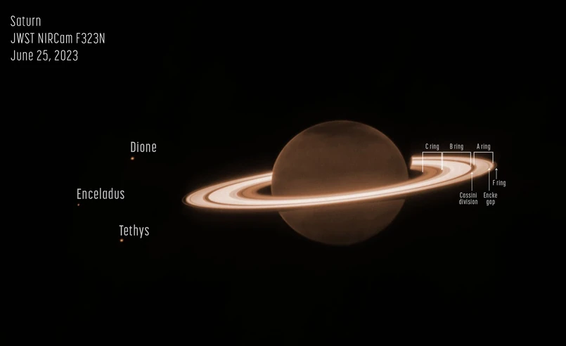 Delikatne rozjaśnienie na krawędzi tarczy Saturna może z kolei mieć związek z fluorescencją metanu na dużych wysokościach lub emisją jonów trójwodorowych (H3+) w jonosferze. Tymczasem ogromne pierścienie Saturna nie zawierają metanu i w wykorzystanej w obserwacjach podczerwieni wyjątkowo jasno świecą. Towarzyszy im kilka księżyców, w tym Dione, Enceladus i Tetyda.
