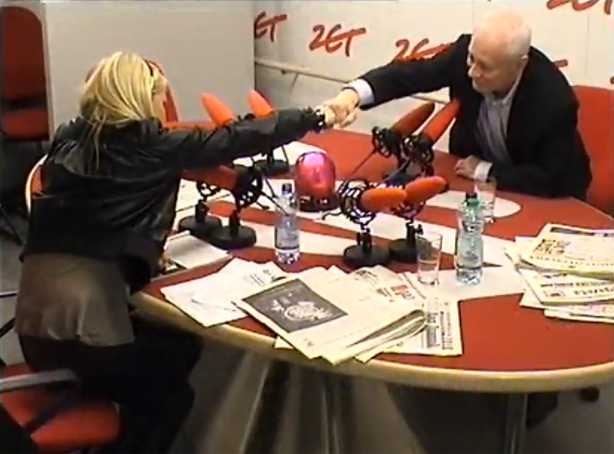 "Żółwik", zamiast podania ręki, miał chronić polityka i dzienikarkę Radia ZET przed świńską grypą. Ale to zdarzyło się dopiero na sam koniec wywiadu.