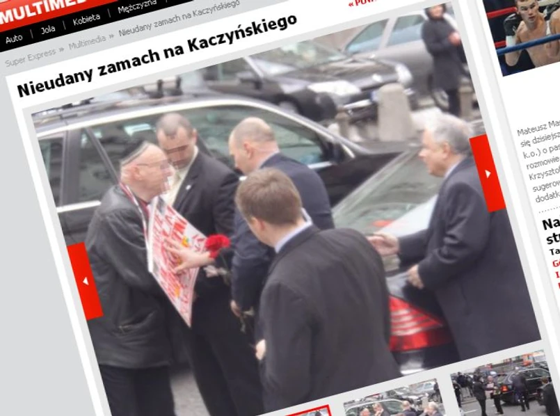 Ochroniarze prezydenta natychmiast zasłonili Lecha Kaczyńskiego swoimi ciałami - relacjonuje "Super Express". Odprowadzili też natręta na bezpieczną odległość.