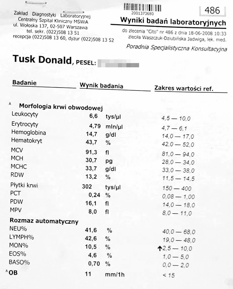 "Fakt" opublikował dzisiaj wyniki badań Donalda Tuska. Na stronach internetowych kancelarii premiera znalazła się jedynie opinia o jego zdrowiu lekarza, który badał szefa rządu. "Bez wykrywalnych objawów choroby, bardzo dobra wydolność organizmu " - napisał profesor medycyny Zbigniew Gaciong.