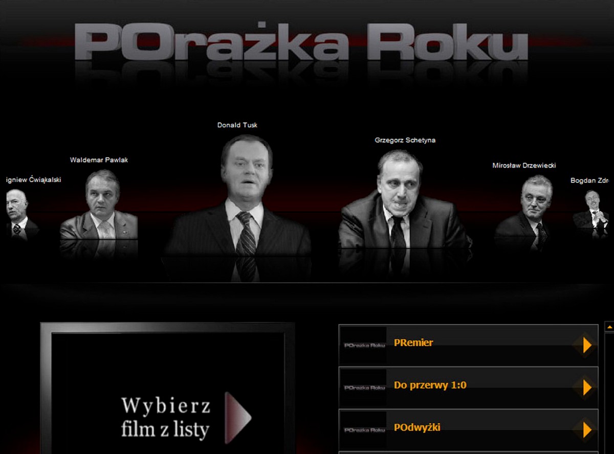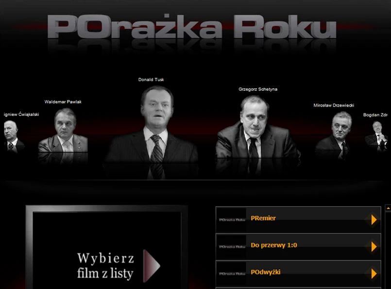 Strona www.porazkaroku.pl wystartuje w niedzielę o godzinie 13. Na razie można przeczytać tam jedynie tajemniczą zapowiedź, że wtedy dowiemy się, kto zaliczył największą porażkę roku. Ale my już wiemy - to domena wykupiona na rok przez klub parlamentarny PiS. Cel? Rocznica rządu Donalda Tuska. Znajdzie się na niej 20 filmików zmontowanych głównie z wypowiedzi polityków koalicji ostatniego roku. Dotyczą m.in. prywatyzacji szpitali, 10 zobowiązań PO czy dialogu społecznego.
