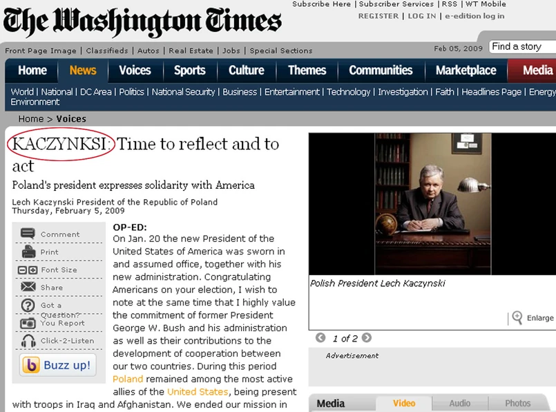 Tekst zaczyna się od wielkiego nagłówka. "KACZYNKSI: Time to reflect and to act". Nazwisko prezydenta jest przekręcone, a w krótkim opisie pod listem dziennik nakreślił sylwetkę prezydenta i przypomniał, że jest on... byłym aktorem dziecięcym i długoletnim doradcą Lecha Wałęsy.