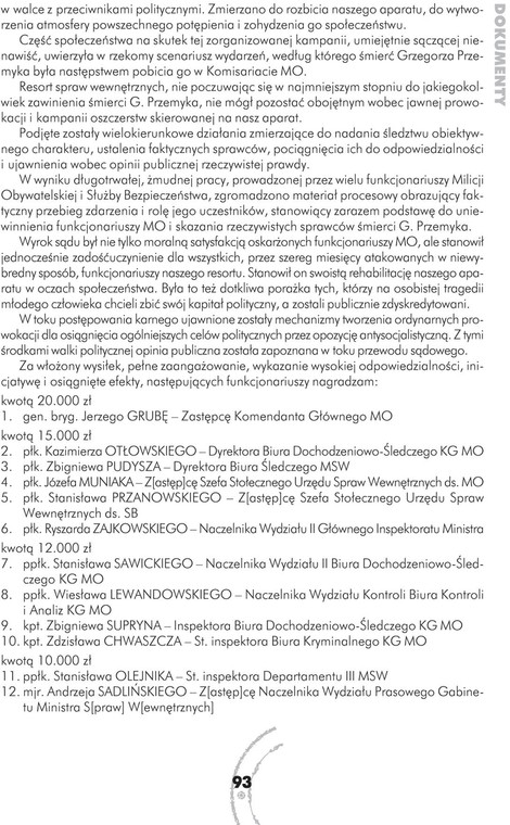 W 1984 r. Kazimierz O. za to jak prowadził śledztwo w sprawie Przemyka otrzymał nagrodę od Czesława Kiszczaka - wtedy szefa MSW. Kiszczak wyróżnił go za "włożony wysiłek, pełne zaangażowanie, wykazanie wysokiej odpowiedzialności, inicjatywę i osiągnięte efekty". Dostał 15 tys. złotych - dwie dobre ówczesne pensje.
