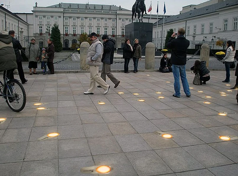Koncepcję pomnika ofiar katastrofy smoleńskiej przed Pałacem Prezydenckim, który tworzyłoby 96 nieregularnie rozmieszczonych reflektorów zainstalowanych w chodniku, zaprezentował w poniedziałek architekt Paweł Szychalski.