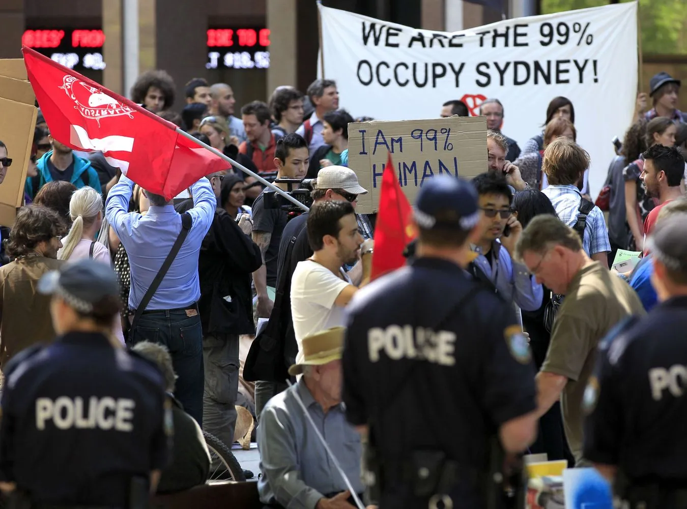 W czasie przemarszu skandowali: "My płacimy za wasz kryzys", "Wasze błędy nasza kasa", "Demokracja teraz dla nas", "Nasza władza wciąż nas zdradza", "Precz z bankami ludojadami", "Nasze życie jest wartością" oraz "Kapitalizm - to się leczy", "Władza w ręce ludu" i "Lud zjednoczony nie będzie zwyciężony".