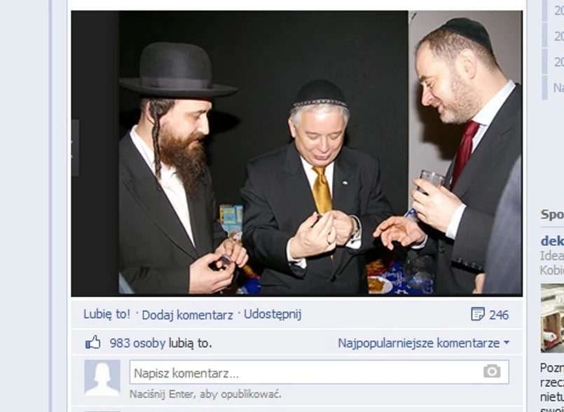 Korwin-Mikke zdaje się sugerować , że Jarosław Kaczyński, to tajny agent ultra tajnej żydowskiej organizacji. Wpis opatrzony jest zdjęciem Kaczyńskiego w jarmułce, tyle że zmarłego w 2010 roku Lecha, jak zauważa dziennikarz "Newsweek Polska" .