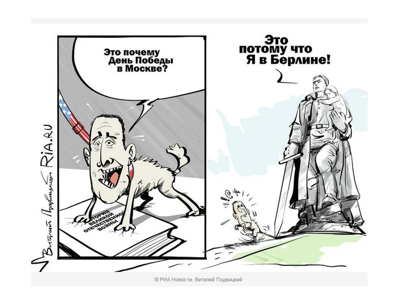 A to dlaczego Dzień Zwycięstwa w Moskwie? - pyta Schetyna na karykaturze, opierając się na książce zatytułowanej "Historia wielkiej wojny ojczyźnianej". Dlatego, że ja w Berlinie - odpowiada mu na to czerwonoarmista z pomnika z dzieckiem na jednym ramieniu i z mieczem w drugiej dłoni. Rysunek opublikowany przez agencję informacyjną RIA Novosti odnosi się do ostatnich komentarzy szefa polskiej dyplomacji, który najpierw próbował przekonywać, że niemiecki obóz koncentracyjny Auschwitz wyzwalali Ukraińcy, a potem zaczął głośno zastanawiać się nad zorganizowaniem na Westerplatte obchodów 70. rocznicy zakończenia II wojny światowej.
