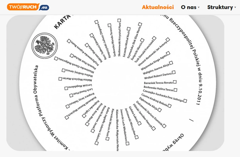 Okrągła karta z nazwiskami kandydatów rozchodzącymi się promieniście miałaby też dać gwarancję, że ludzie głosowaliby na konkretną osobę, a nie na "numer na liście".