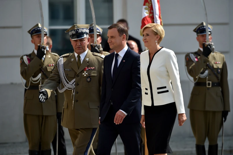 Prezydent i Pierwsza Dama zostali powitani przed Pałacem Prezydenckim. Andrzej i Agata Dudowie przechodząc po dziedzińcu, oddali honory sztandarom wojskowym. W drzwiach gmachu powitał ich Jacek Michałowski, szef kancelarii byłego prezydenta Bronisława Komorowskiego.