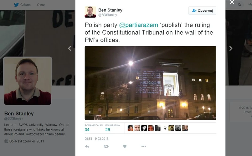 W tej sytuacji Partia Razem postanowiła nie czekać. Wieczorem na budynku Kancelarii Premiera członkowie ugrupowania opublikowali wyrok Trybunału Konstytucyjnego. Użyli do tego projektora o dużej mocy. Efekt? Z pewnością robi wrażenie.
