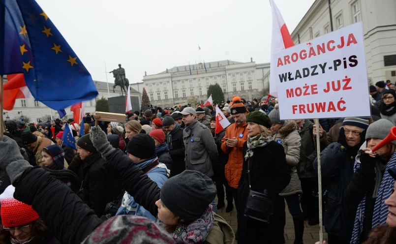 Manifestujący skandowali: "obronimy demokrację", "wolność, równość, demokracja"; trzymają flagi polskie i unijne, plakaty z napisem: "Kocham Polskę".