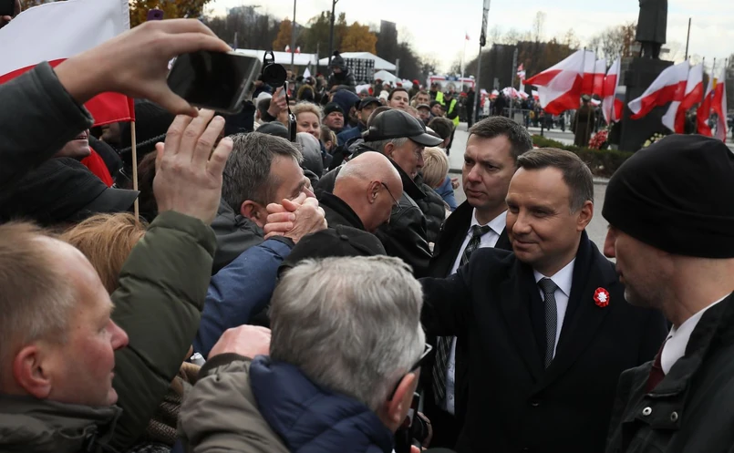 Na nagraniu widać prezydenta Andrzeja Dudę, który w otoczeniu oficerów BOR przemieszcza się przez tłum ludzi Krakowskim Przedmieściu.