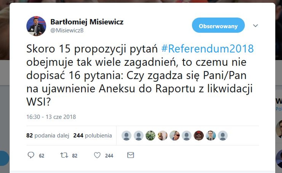 Zdaniem Bartłomieja Misiewicza należałoby dopisać jeszcze jedno, 16 pytanie: "Czy zgadza się Pani/Pan na ujawnienie Aneksu do Raportu z likwidacji WSI?".