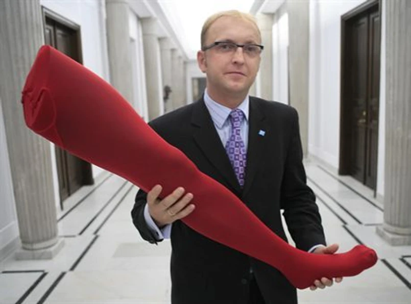 Nie chciał zdradzić, w jaki sposób wszedł w jej posiadanie. "A bo to mało manekinów w Polskiej polityce" - żartuje. I dodaje, że wystarczyła godzina, aby zdobyć manekina z czerwoną nogą, ale skąd - to tajemnica sztabu wyborczego. Ujawnia jedynie, że noga jest męska. Skąd wie, jaką płeć ma polska lewica? "Nie wiem, po prostu mamy wielką, męską lewą nogę ubraną w czerwoną pończochę, którą sprezentujemy premierowi" - stwierdza.