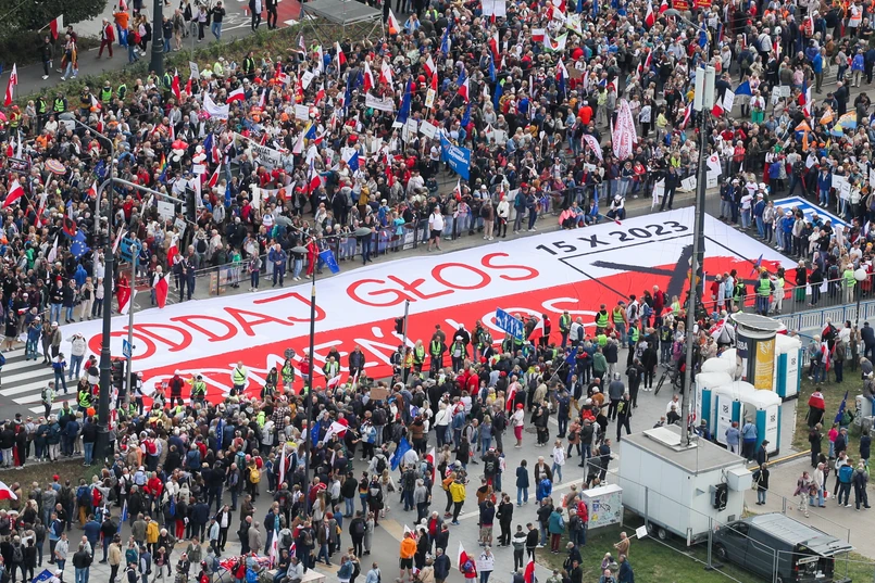 1/16 Kampania wyborcza do parlamentu 2023. Uczestnicy zorganizowanego przez Koalicję Obywatelską "Marszu Miliona Serc" zbierają się na Rondzie Dmowskiego w Warszawie.