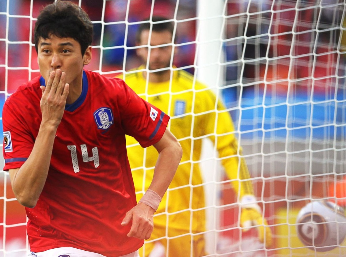 Pierwsza bramka dla Azjatów padła już w siódmej minucie, po błędzie defensywy Greków i strzale z bliska Lee Jung-soo. Od tego momentu tempo meczu wyraźnie spadło. W dalszym ciągu lepsze wrażenie sprawiali Koreańczycy, ale obie drużyny miały problemy ze stwarzaniem sytuacji podbramkowych. Kibice poderwali się z miejsc dopiero w 28. minucie, gdy po kolejnym błędzie greckiej defensywy Park Chu-young znalazł się sam przed Alexandrosem Tzorvasem. Górą był jednak golkiper Hellady Alexandros Tzorvas.