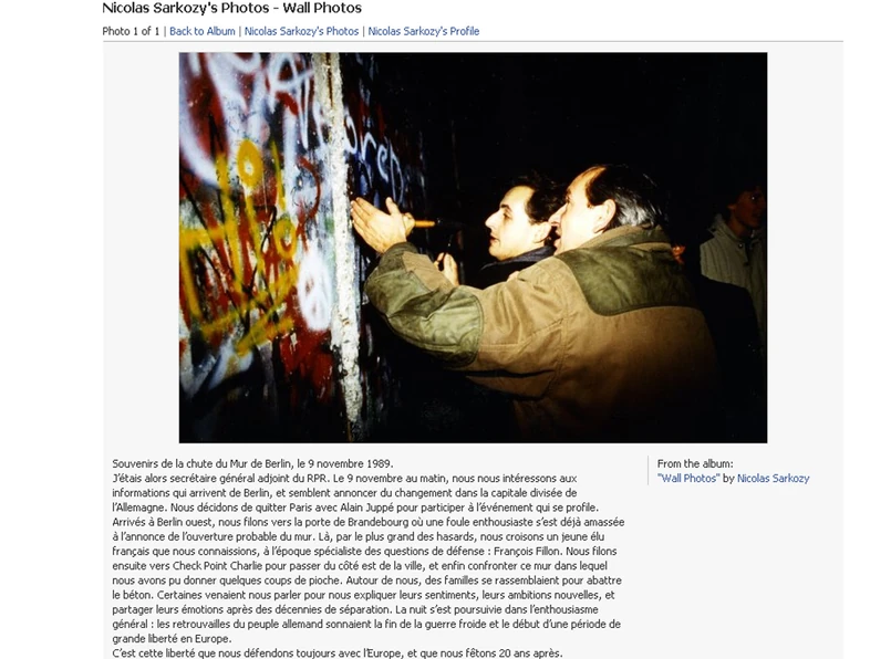 Tymczasem Sarkozy w notce na Facebooku żywo opisuje zdarzenia 9 listopada. Jak obserwował entuzjazm berlińczyków, jak dzielili się z nim swoimi nadziejami i uczuciami. Opisuje też, że przez kompletny przypadek wśród wiwatujących tłumów spotkał obecnego premiera Francois Fillona. A do Niemiec pojechał razem z innym późniejszym premierem - Alainem Juppe.