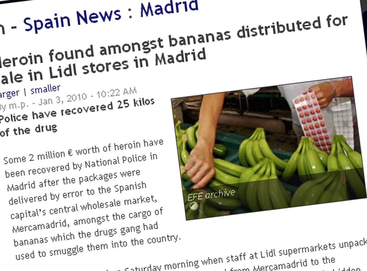 Takiego asortymentu nie było jeszcze w żadnym supermarkecie. Chodzi o paczki z heroiną, ukryte w kartonach z bananami, które trafiły sieci Lidl w Madrycie. Nie była to promocja dla narkomanów, lecz wpadka kartelu, który przez pomyłkę wybrał nie ten kanał dystrybucji, co trzeba.
