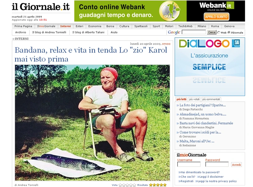 Nieznane wcześniej fotografie polskiego papieża z okresu, kiedy był biskupem Krakowa, opublikował włoski dziennik "Il Giornale". Zdjęcia zostały zrobione w trakcie jednej z letnich wycieczek, na które Karol Wojtyła jeździł ze swoimi przyjaciółmi skupionymi w grupie studentów Uniwersytetu Jagiellońskiego, nazywanej nieformalnie "Środowiskiem". Przyszły papież wraz ze swoimi studentami pływał na kajakach i prowadził długie nocne rozmowy o miłości i odpowiedzialności.