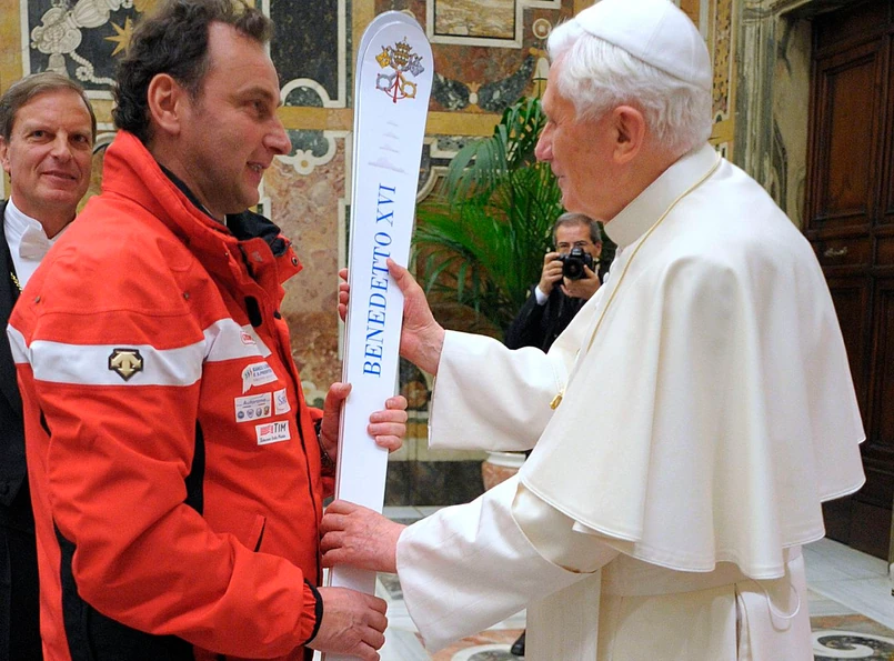 Benedykt XVI otrzymał w poniedziałek narty i biały kombinezon narciarski z napisem "maestro" (instruktor). Prezenty dostał od włoskich instruktorów narciarskich, wśród których był szef dyplomacji Franco Frattini.
