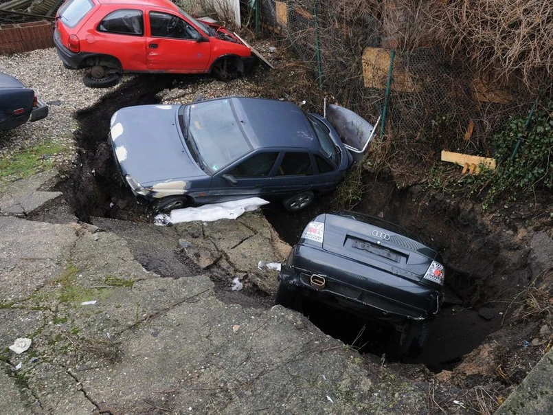W tym niecodziennym wypadku nikt na szczęście nie ucierpiał. Prawdopodobnie w samochodach, które zapadły się pod ziemię, nie było ludzi.