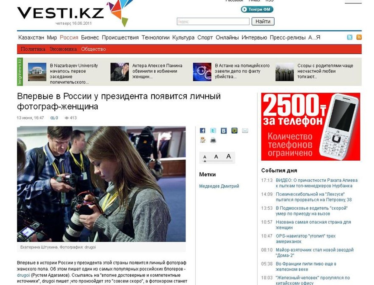 Dmitrij Miedwiediew na stanowisku osobistego fotografa po raz pierwszy w historii zatrudnił kobietę. Prezydenta fotografować będzie Jekatarina Sztukina, która do tej pory pracowała w jednej z największych rosyjskich gazet, a mianowicie w "Izwiestiach".