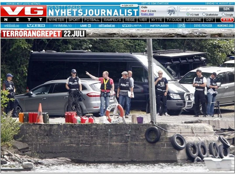 Według norweskiego tabloidu "Verdens Gang" 32-letni Breivik i śledczy przebywali na wyspie ok. 8 godzin. Zamachowiec miał na sobie kamizelkę kuloodporną, a nogi miał skute kajdankami.