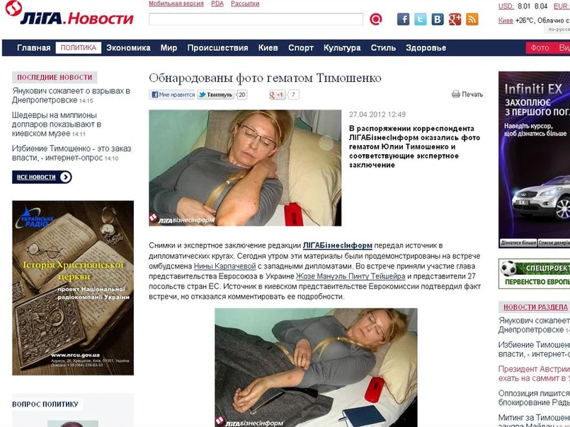 Wcześniej Nina Karpaczewa prezentowała zdjęcia zrobione Julii Tymoszenko w czasie spotkania z europejskimi dyplomatami. Na fotografiach była ukraińska premier pokazuje siniaki na brzuchu, nadgarstkach, przedramionach. W spotkaniu uczestniczył także przedstawiciel Unii Europejskiej na Ukrainie, Jose Manuel Pintu Teisheira.