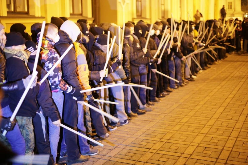 Na placu świętego Michała i na przyległych ulicach niemal nie ma milicji. Jest za to kilkudziesięciu nacjonalistów, którzy ostentacyjnie ćwiczą z plastikowymi pałkami obronę przed ewentualnym atakiem oddziałów specjalnych.