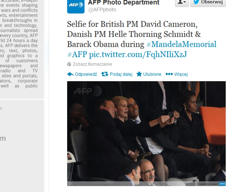 Na zdjęciu widać, jak prezydent USA Barack Obama robi sobie z ręki zdjęcie z premierem Wielkiej Brytanii Davidem Cameronem i premier Danii Helle Thorning Schmidt.