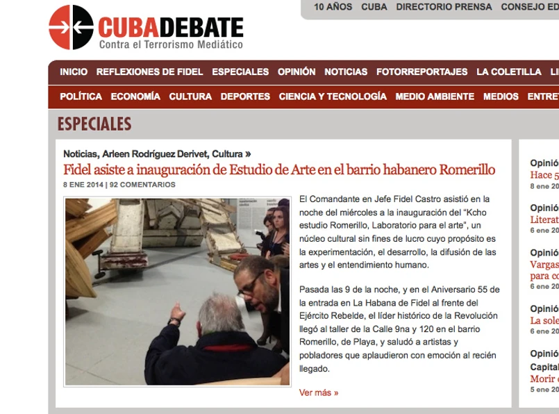 Zdjęcie 87-letniego Fidela Castro opublikował rządowy portal cubadebate. Nie widać na nim twarzy polityka, który siedząc na fotelu pokazuje jedną z prac na ekspozycji. Całą postać poruszającego się o lasce Fidela z długą, białą brodą pokazują zdjęcia zrobione przez fotografa agencji Getty Images. To pierwsze publiczne wystąpienie przywódcy kubańskiej rewolucji od kwietnia zeszłego roku. Pokazuje się on niezwykle rzadko, co wzmaga plotki na temat jego złego stanu zdrowia.
