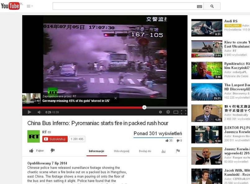 To cud, że nikt nie zginął w pożarze autobusu w Hanghzou. Mężczyzna rozlał na podłogę zatłoczonego pojazdu komunikacji miejskiej kilka litrów oleju bananowego i podpalił go. Rannych zostało 32 osoby. Oto wideo z kamer bezpieczeństwa autobusu.