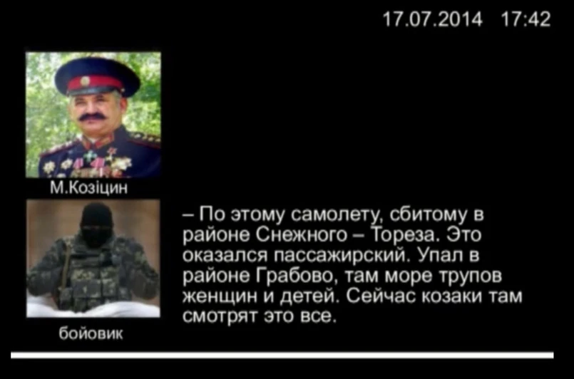 Służba Bezpieczeństwa opublikowała dwie krótkie rozmowy. W obydwu z nich separatyści przyznają się do tego, że zestrzelili samolot. Bojówkarze pojechali na miejsce i byli zdziwieni, że wśród ofiar byli tylko cywile, a na pokładzie nie było broni.