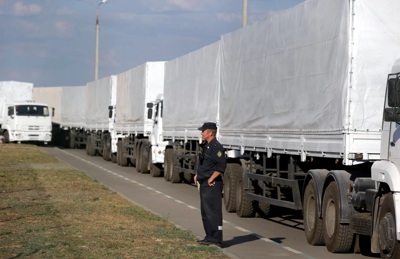 Niemal 300 rosyjskich ciężarówek od tygodnia czekało na zaimprowizowanym parkingu koło przejścia "Donieck- Izwarino" na granicy rosyjsko- ukraińskiej. Część została skontrolowana przez ukraińskie i rosyjskie służby graniczne oraz opieczętowana przez przedstawicieli Międzynarodowego Czerwonego Krzyża.