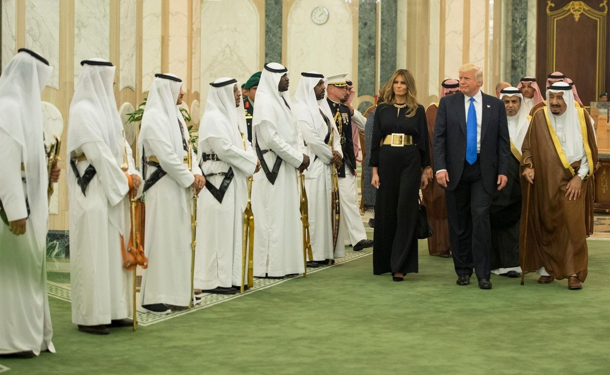 Na zdjęciach zrobionych po wylądowaniu prezydenckiego Air Force One w Rijadzie Melania Trump jest skromnie ubrana w długi czarny kombinezon ze złotym pasem, ale nie ma zakrytej głowy, czego wymaga się od obywatelek Arabii Saudyjskiej. Córka Trumpa, Ivanka, także jest bez chusty.