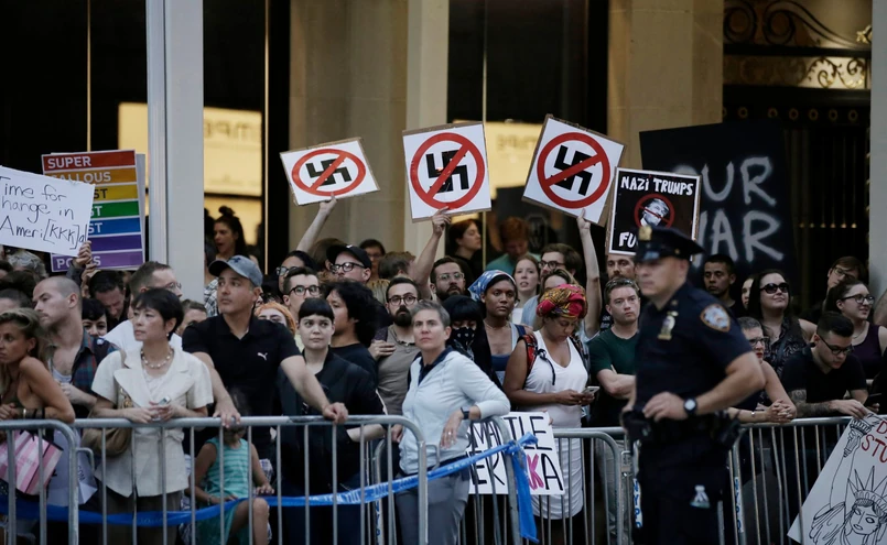 Donald Trump na wtorkowej konferencji prasowej w Trump Tower, wracając do swojej pierwotnej narracji. W pierwszej reakcji, w sobotę, oświadczył on, że na tego typu przemoc nie ma miejsca w Ameryce, i potępił "jawny pokaz nienawiści, zajadłości i przemocy z wielu stron, z wielu stron".