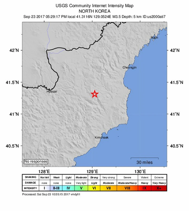 3 września w Korei Północnej dwa wstrząsy - pierwszy o magnitudzie szacowanej przez różne źródła na 5,6-6,3 oraz drugi o magnitudzie 4,6 - nastąpiły w odstępie kilku minut na zerowej głębokości. Kilka godzin po wstrząsach państwowa telewizja północnokoreańska poinformowała, że "całkowitym powodzeniem" zakończyła się próba z użyciem bomby wodorowej. Była to szósta północnokoreańska próba nuklearna.